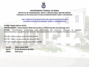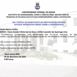 Start 4 de dezembro de 2025 - 09:00 End 4 de dezembro de 2025 - 11:00 + GOOGLE CALENDAR + ICAL IMPORT Related Events A AMBIENTALIZAÇÃO CURRICULAR EM CURSOS DE LICENCIATURA E BACHARELADO EM CIÊNCIAS BIOLÓGICAS DA UNIVERSIDADE FEDERAL DA BAHIA 21 de julho de 2025 09:00 A ASSISTÊNCIA ESTUDANTIL COMO POLÍTICA PÚBLICA NO CENTRO DE FORMAÇÃO DE PROFESSORES DA UNIVERSIDADE FEDERAL DO RECÔNCAVO DA BAHIA Cancel reply You must be logged in to post a comment. Deixe um comentário Cancelar respostaVocê precisa fazer o login para publicar um comentário.