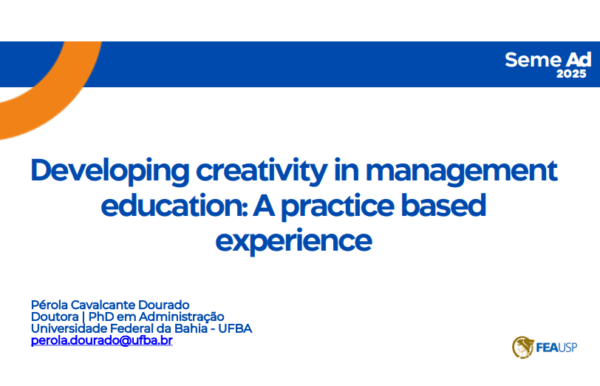 A servidora TAE e atual gerente do IHAC, Pérola Cavalcante Dourado, participou do Seminário Anual de Administração da USP (SemeAD 2025), apresentando o trabalho “Developing creativity in management education: A practice-based experience”. Um estudo empírico resultante da sua tese de Doutorado e que também informa sobre a expansão do corpus da pesquisa. Com as participações no Congresso UFBA e a realização da “Oficina Interinstitucional – Criatividade e inovação aplicadas ao serviço público”, no último mês de outubro, o escopo agora se volta para os colegas servidores públicos.